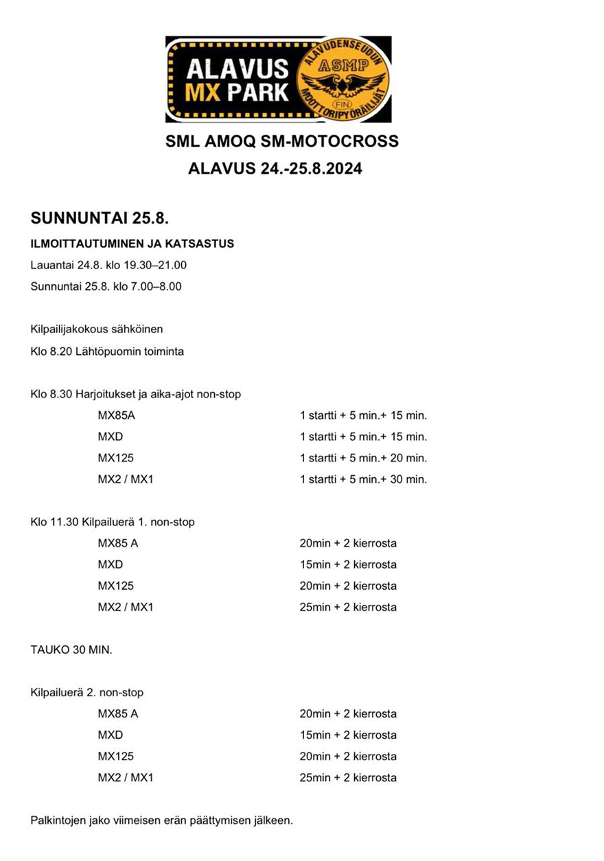 Motocrossin SM-sarja jatkuu viikonloppuna Alavudella. Tässä kilpailun aikataulu.