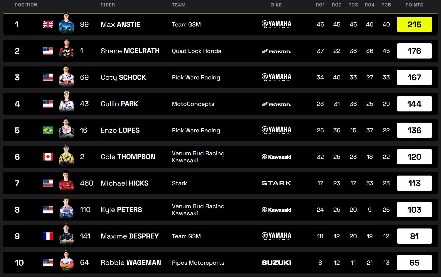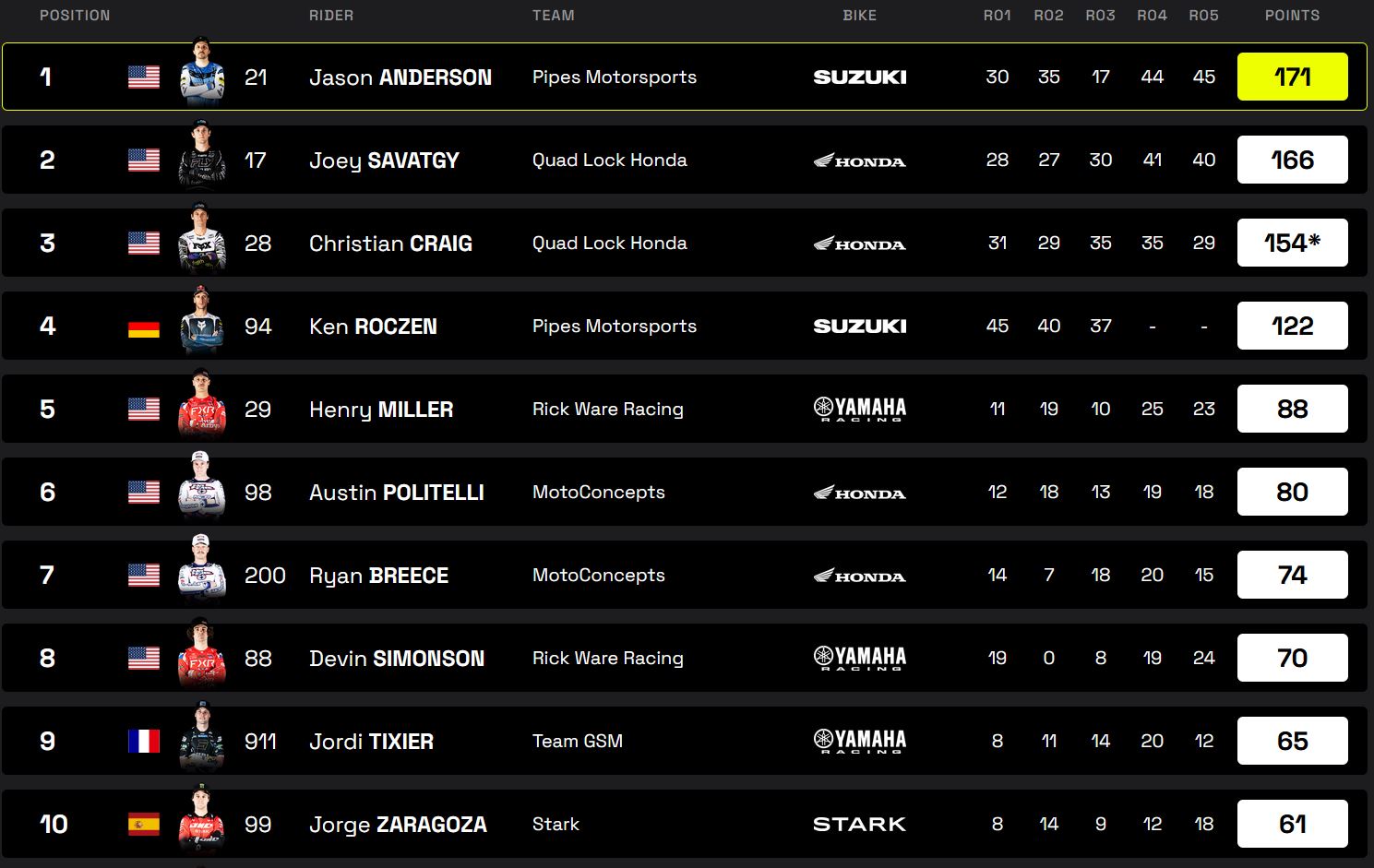 Christian Craigin ilta oli vaikeampi. Hän kaatui ensimmäisessä sprintissä ja uudelleen toisen sprintin avauskierroksella, mikä pudotti hänet yhdeksänneksi. Craig kokosi itsensä finaalissa ja ajoi kolmanneksi, mutta kokonaispisteissä Colt Nichols nappasi kolmannen sijan kauden viimeisellä palkintokorokkeella. Craig oli kuitenkin sarjassa kolmas.