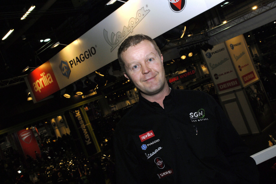 Aluepäällikkö Kai Suokko esittelee MP11-messuilla Piaggio-konsenin tuotteita. Aluepäällikkö Kai Suokko esittelee MP11-messuilla Piaggio-konsenin tuotteita.