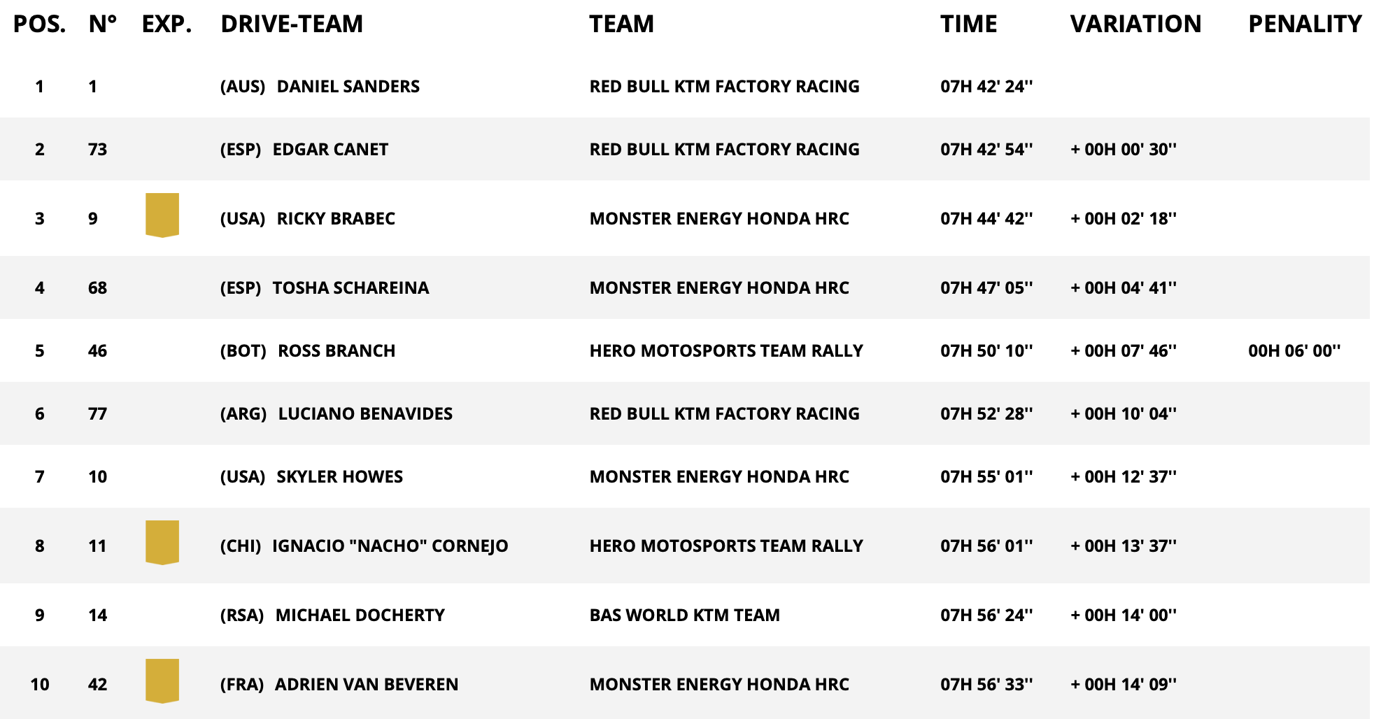 Hieman taaempana, mutta omassa rauhassaan, Monster Energy Hondan Ricky Brabec ja Tosha Schareina vaihtoivat nopeimpia väliaikoja. Brabec oli lopulta päivän nopein puhtaalla ajalla, mutta pitkä erikoiskoe ja KTM-kaksikon keräämät bonukset ratkaisivat. Canet ja Sanders saivat bonusaikaa 5.42 ja 4.04.