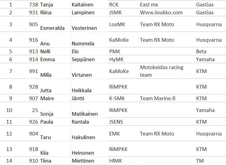 Naisten SM-luokassa ensimmäisenä lähtöpaikan saa valita Tanja Kaitainen, perässään Riina Lampinen ja Esmeralda Vesterinen. Viime vuoden mestari Anu Nummela on neljäs.
