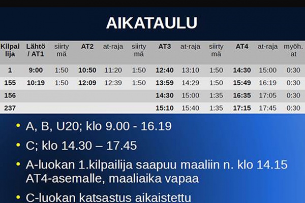 Alla aikataulu, reittikartta ja maastokokeiden sijainnit.