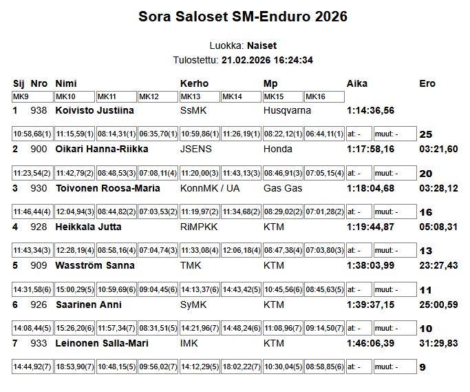 Sysmässä ajettiin tänään naisten SM-sarjan kauden kolmas osakilpailu. Ensimmäisen osakilpailun voittanut Justiina Koivisto oli tänään lyömättömässä vauhdissa ja kaasutteli voittoon kolmen minuutin ja 21 sekunnin erolla.