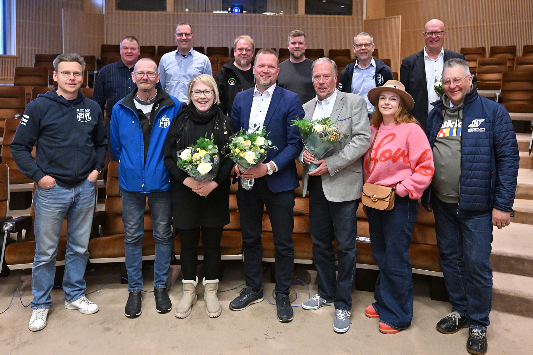 Suomen Moottoriliiton liittokokouksessa tänään 25.4.2026. Ylärivissä vasemmalta: Markku Nissinen, Sami Sainio, Tomi Kapanen, Erkki Misikangas, Pekka Kulju, väistyvä puheenjohtaja Erkki Heikkinen. Alarivissä vasemmalta: Niko Tynnilä, Jarkko Nikkinen, 1. varapuheenjohtaja Jonna Kyllästinen, puheenjohtaja Henri Saari, 2. varapuheenjohtaja Jari Heinilä, Miia-Maria Vepsäläinen ja hallitustyön jättävä Jukka Lainkari.