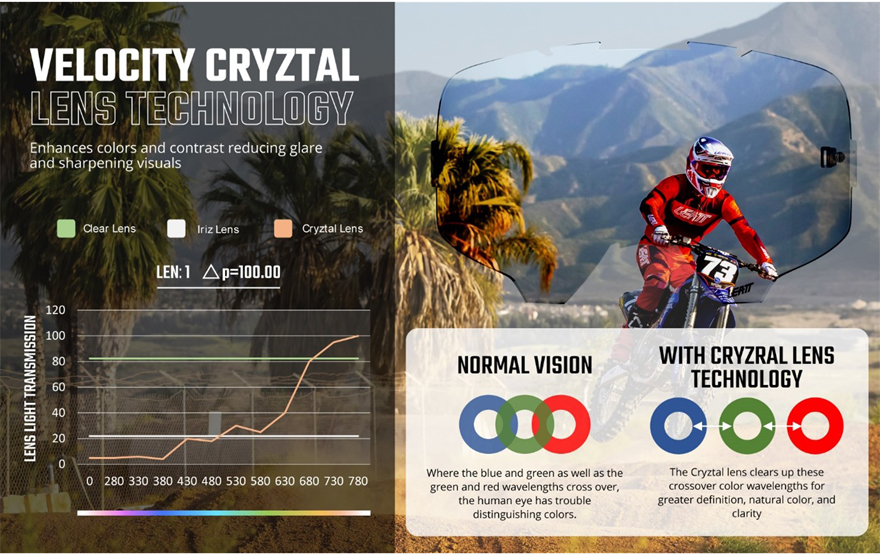 Täysin uusi Cryztal-linssiteknologia on saatavilla Velocity 6.5 ja 5.5 malleissa. Tämä korkean kontrastin, värit erottelevan teknologian avulla saavutetaan uskomaton kirkkaus, mikä mahdollistaa kuljettajille radan tai polkujen kokemisen aivan uudella tavalla. Nämä kaksi uutta linssisuunnittelua varmistavat, että Velocity-ajolasit pysyvät ajoturvallisuuden ja suorituskyvyn kärjessä.