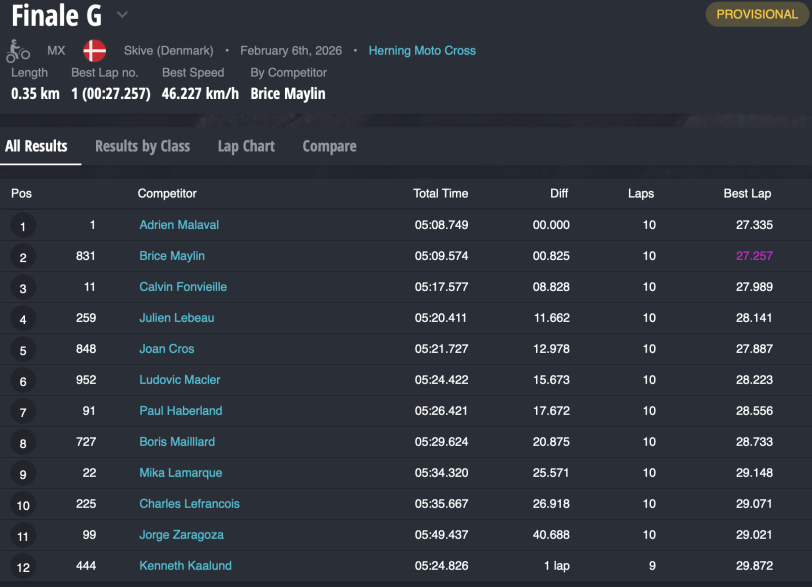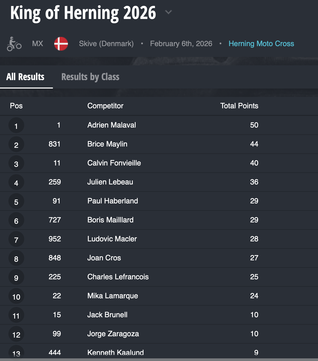 Tampere Supercrossin marraskuussa voittanut Adrien Malaval kaasuttelin Herningin supercrossin toisenkin illan voittoon. Tällä kertaa Malaval johti kisaa ensimmäisestä kierroksesta lähtien. Perjantaina tapaan toiseksi ajoi Brice Maylin, Calvin Fonvieillen ollessa kolmas. Miro Varjonen ei valitettavasti pystynyt starttaamaan toiseen kisapäivään vatsataudin takia.