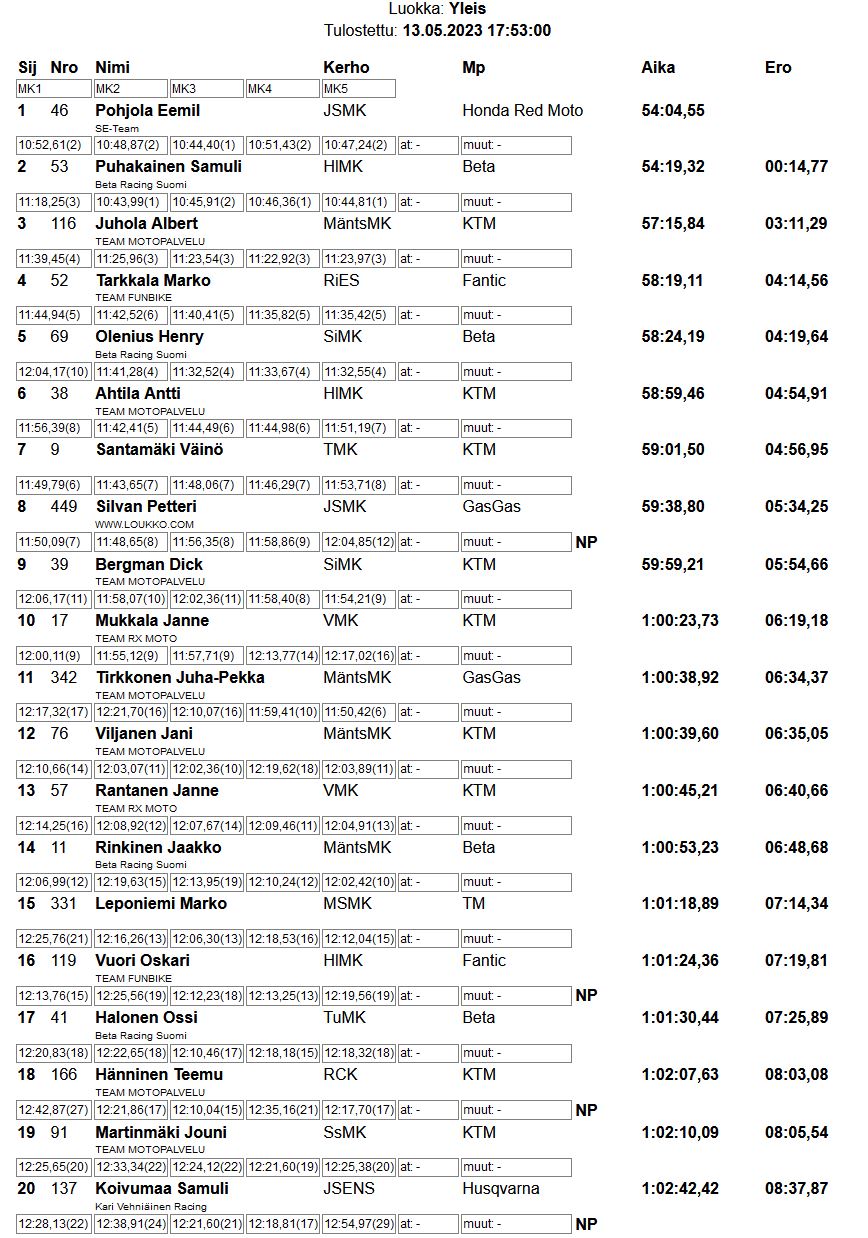 Team Motopalvelun Albert Juhola ajoi kilpailussa kolmanneksi, jääden reilut kolme minuuttia voitosta. Team Funbiken Fantic-kuljettaja Marko Tarkkala oli puolestaan neljäs, jääden minuutin Juholalle. Beta Racingin Suomen Henry Olenius kaasutteli viidenneksi, jääden vain vajaat viisi sekuntia Tarkkalalle.