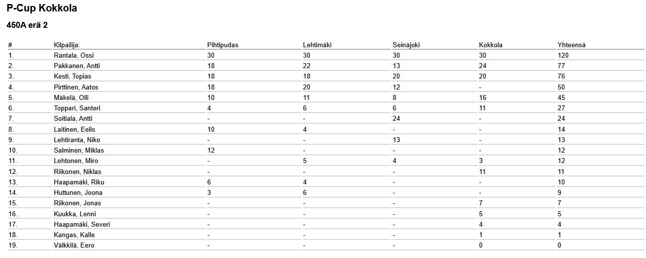 Pohjanmaa Cupin tulokset 250A- ja 450A-luokkien osalta: