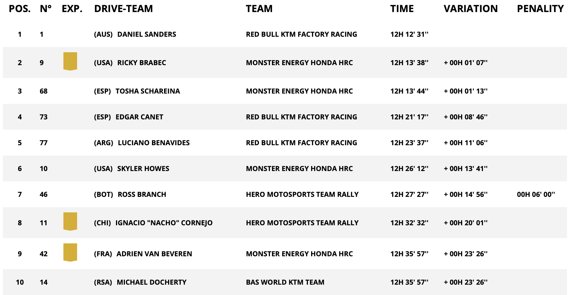 Kokonaiskilpailussa Sanders johtaa edelleen, mutta Honda-kaksikko Brabec–Schareina on nyt hieman yli minuutin päässä. Tässä vaiheessa tämä kolmikko näyttää selvältä ennakkosuosikilta mestaruuteen.