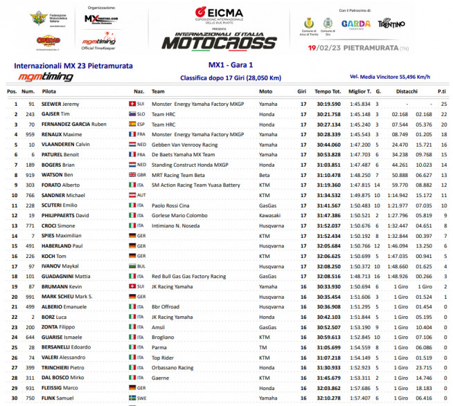 Italian kahden osakilpailun mittainen kansainvälinen mestaruussarja päättyi eilen ja Trentinossa. Todellisen pikasarjan mestariksi kruunattiin Yamahan Jeremy Seewer, joka vei nimiinsä eilen molemmat kisaerät. Huomio eilen kohdistui kuitenkin Tim Gajseriin, joka oli ensimmäisessä erässä toinen, mutta kaatui rajusti toisessa erässä. Erä keskeytettiin Gajserin kaatumisen jälkeen ja ensimmäisten huhujen mukaan Honda-kuljettajan reisiluu olisi murtunut kaatumisessa. Eilen ensimmäisessä erässä kolmanneksi ajanut Ruben Fernandez oli toisen erän kakkonen ja Betalle siirtynyt Ben Watson kolmas. MXGP-luokassa sarjan loppupisteissä toiseksi ajoi Seewerin tiimikaveri Maxime Renaux ja kolmanneksi Ferrandez.
