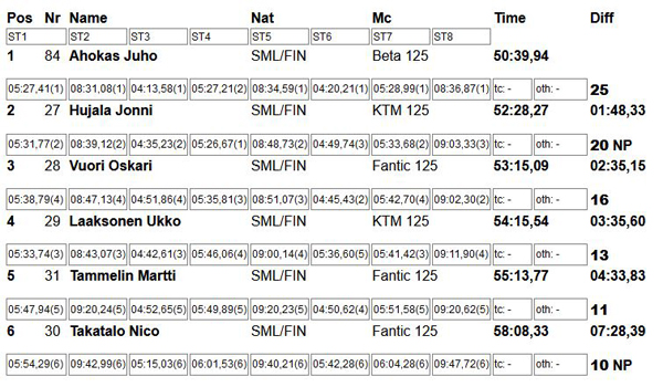 E1-luokan voitto meni luonnollisesti Kytöselle, jolle toiseksi sijoittunut Ahokas jäi reilut kaksi minuuttia. Tiitus Enjala oli kolmas jäi jäi Ahokkaalle 19 sekuntia. Antti Hänninen oli neljäs ja Albert Juhola viides.