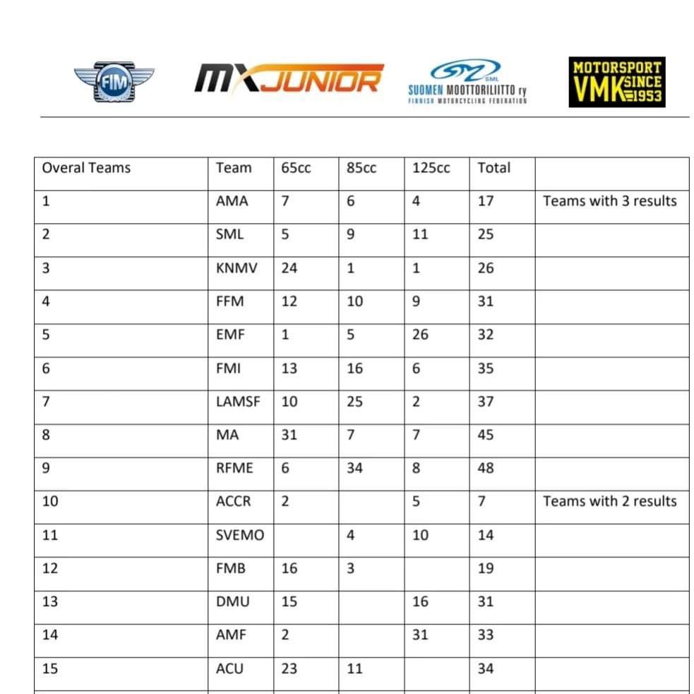Vantaan junioreiden MM-kilpailussa jaettiin henkilökohtaisia mitaleja, mutta jaossa oli myös hieman pienemmän huomion keränneet joukkue MM-mitalit. Joukkuetuloksiin laskettiin jokaisen maan parhaan kuljettajan tulos, jokaisessa luokassa.
