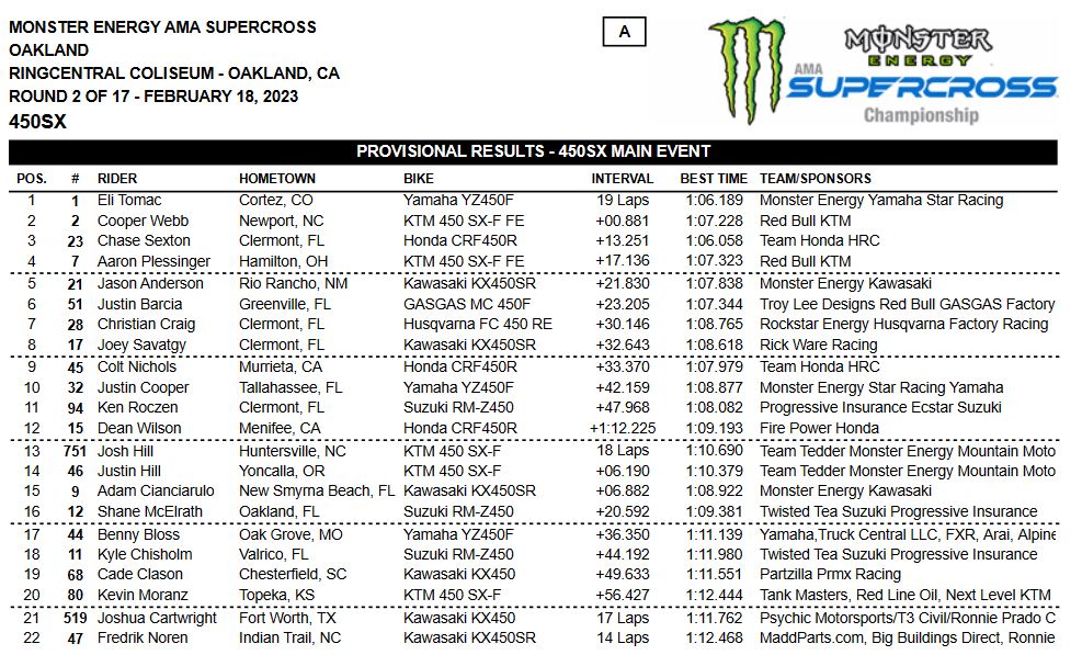 Tomac otti voiton vajaan sekunnin erolla Webbiin. Sexton oli kolmas, jääden 13 sekuntia voitosta. Plessinger oli neljäs ja Anderson viides. Voitto oli Tomacin uran 48. ja samalla hän nousi voittojen määrässä Ricky Carmichaelin rinnalle voittojen määrässä. Kaksikko on nyt kolmantena listalla ja heidän edellään on vain Jeremy McGrath ja James Stewart.