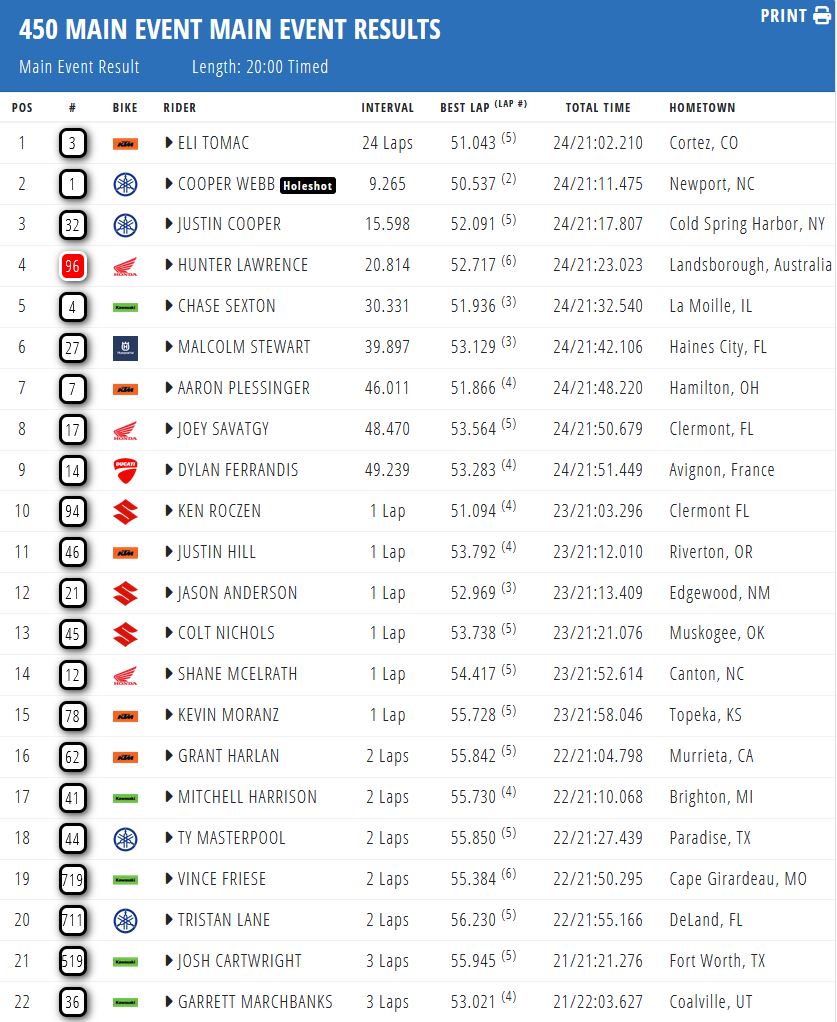 Eli Tomac nousi kilpailun voittoon ohitettuaan alkuvaiheessa kärjessä ajaneen Cooper Webbin. Tomac kasvatti ratkaisevan eron kilpailun toisella puoliskolla ja kuittasi kauden kolmannen voittonsa. Webb joutui tyytymään kakkossijaan.