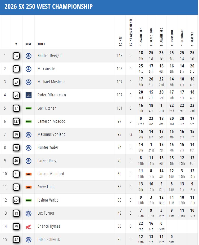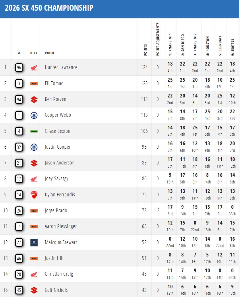 Super Bowl -mestarin, Seattle Seahawksin, kotistadion Lumen Field tarjosi kauden tähän asti tapahtumarikkaimman illan, kun 2026 Monster Energy SMX World Championshipin kuudes osakilpailu ajettiin haastavissa rataolosuhteissa. Pehmeä ja urainen alusta teki 450SMX-luokan finaalista fyysisen taistelun.