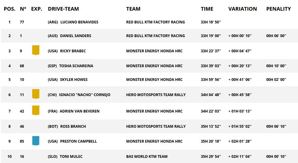Päivän avaintekijä oli se, että Benavides starttasi ensimmäisenä. Argentiinalainen piti vauhdin riittävän kovana pysyäkseen karkumatkalla ja keräsi valtavan määrän bonusaikaa. Yhteensä bonuksia kertyi 7.28, mikä ratkaisi päivän. Benavides nappasi toisen peräkkäisen etappivoittonsa, uransa kahdeksannen Dakar-etappivoiton, ja nousi kokonaiskilpailun johtoon 10 sekunnin erolla tallikaveri Daniel Sandersiin.