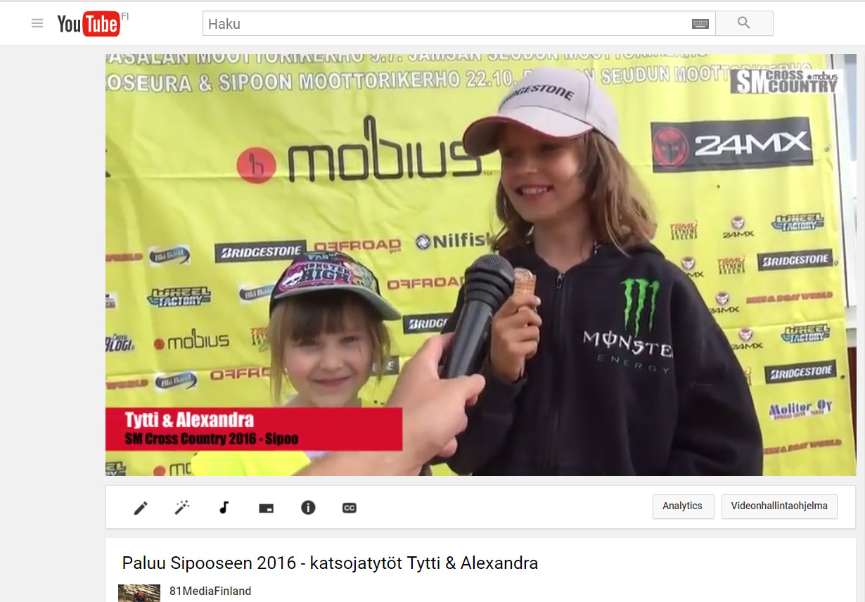 Cross countryn SM-sarjan promoottorin videokansioista löytyä materiaalia, joka saa hymyn kasvoille. Tyttökatsojakaksikko Tytti ja Alexandra iloitsivat viime vuoden Sipoon kilpailusta.