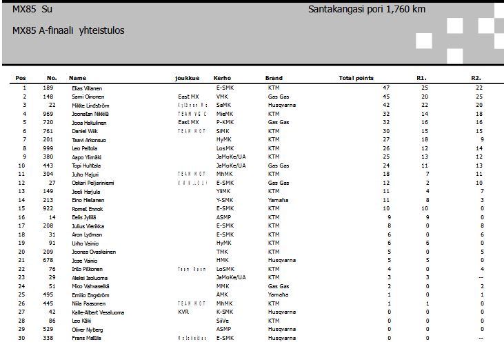 MX85-luokan ensimmäisessä A-finaalissa kärkipaikan nappasi Jeeli Harjula, joka menetti kuitenkin kärkipaikan nopeasti Elias Villaselle. Mikke Lindström otti toisen paikan ja Jooa Hakulinen oli kolmantena. Aika-ajoissa pohja-ajan ajanut Sami Oinonen oli startin jälkeen sijan 10 tuntumassa.